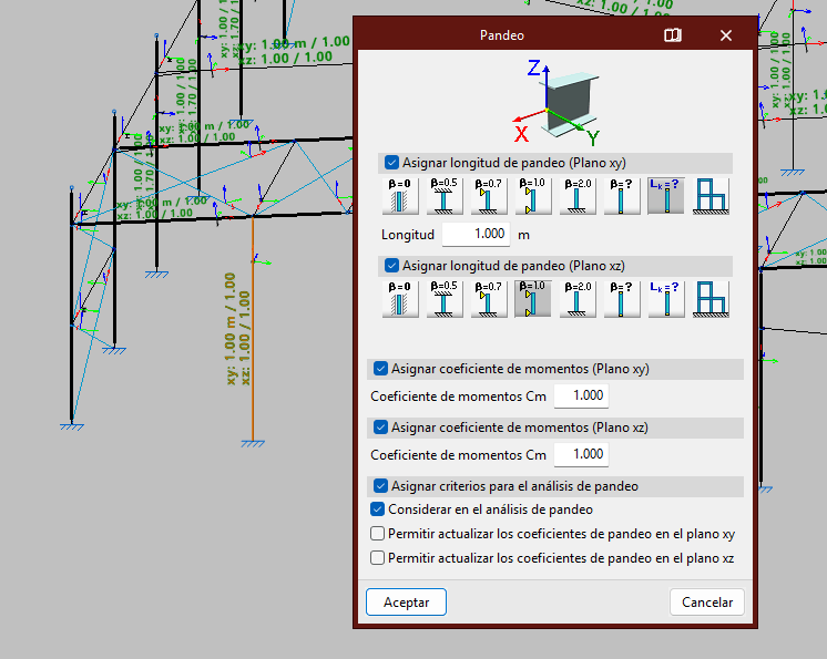 En Barra → Pandeo, revisa las longitudes o coeficientes de pandeo. En naves con pilares esbeltos o con arriostramientos parciales, esto marca la diferencia entre un modelo fiable y uno que “sale” pero no representa el comportamiento real.